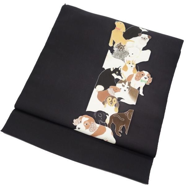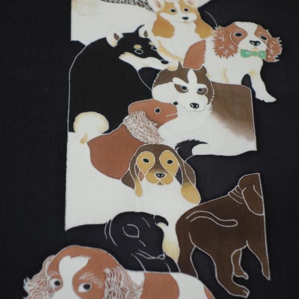 墨黒の紬地に沢山のワンちゃんを染めました。どのワンちゃんも緻密でとても細かく描かれております。